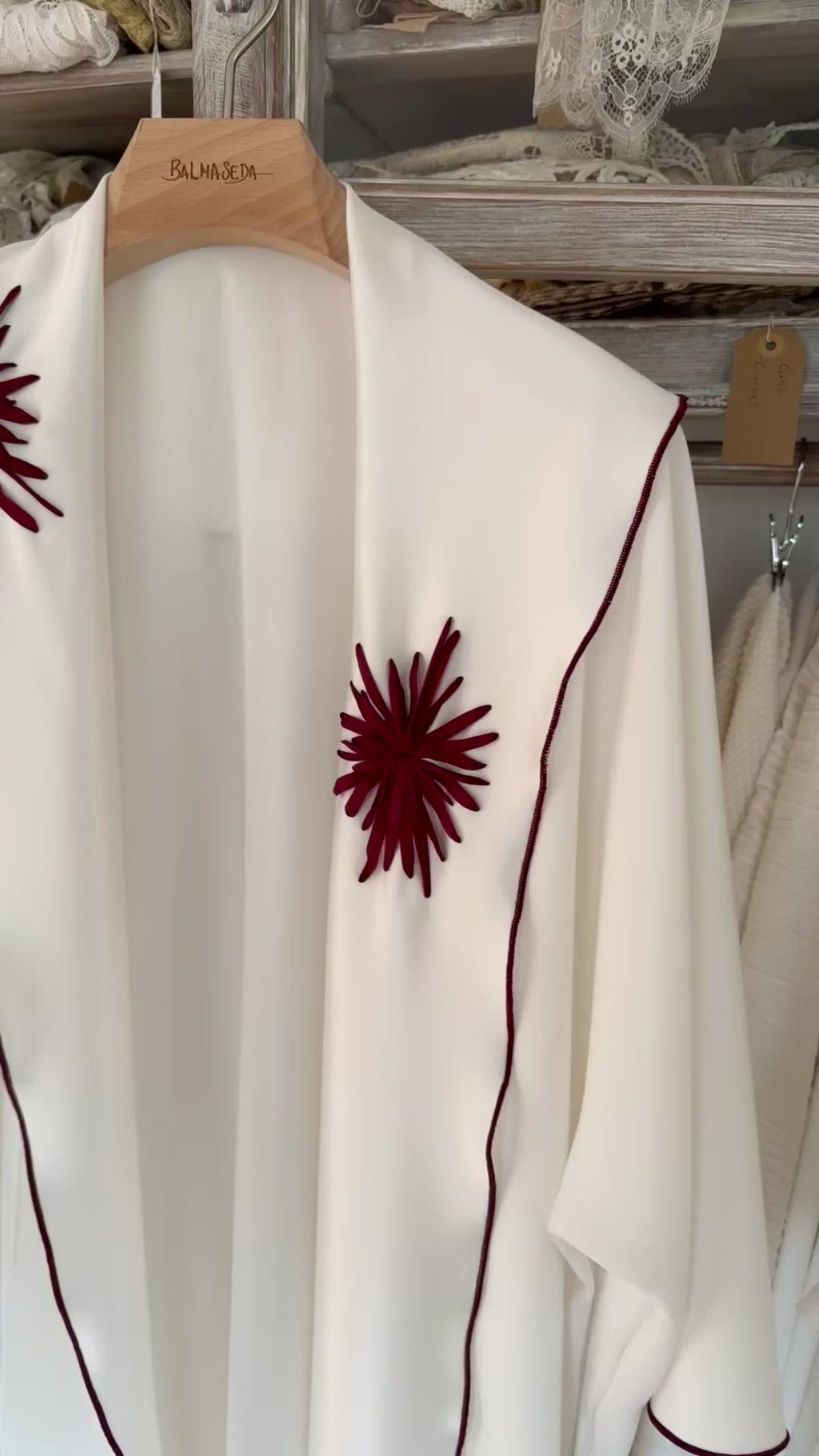 Bata raso y mate bordada a mano con cinta de seda burdeos, corte de mangas japonesas.